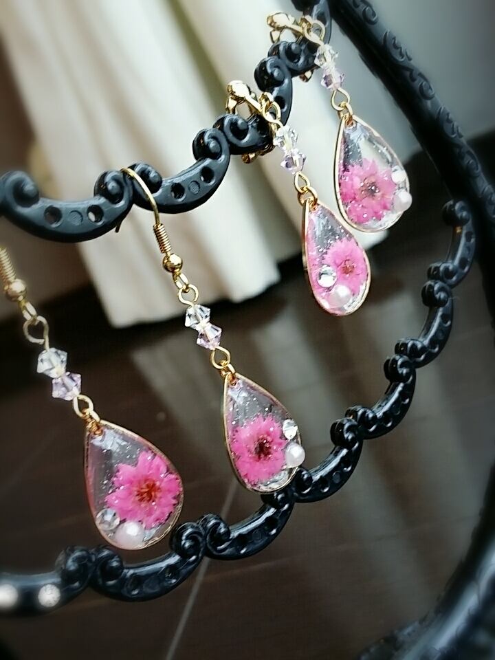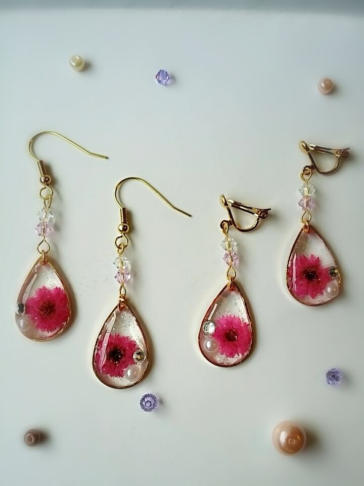 スターフラワー、スワロフスキー、パールをしずく型にとじこめたクリアなピアス。