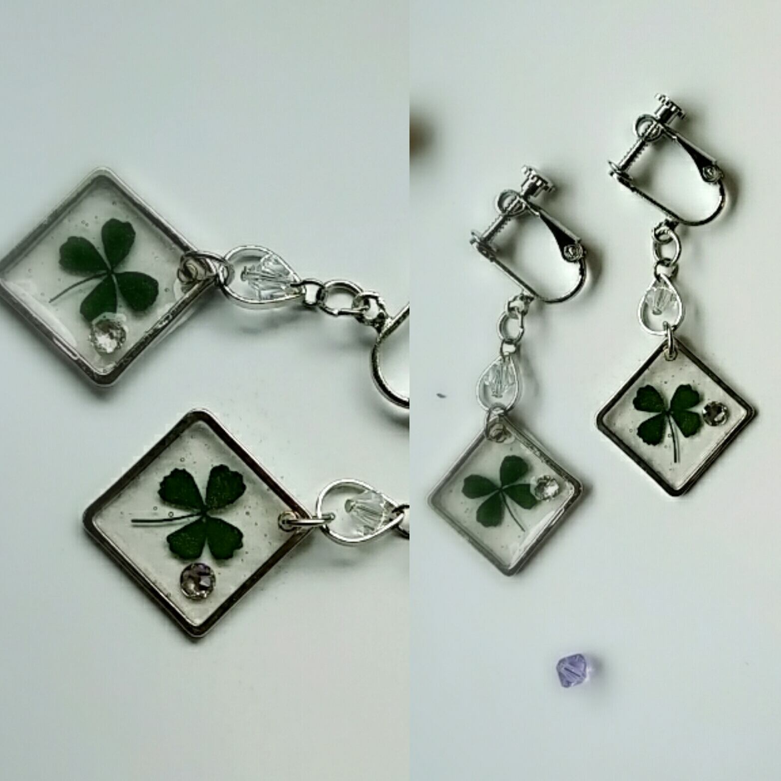 クローバー押し花、スワロフスキーを使用したスクエア型イヤリングです。