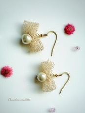 ラメ入りチュールリボンとコットンパールのピアスです。