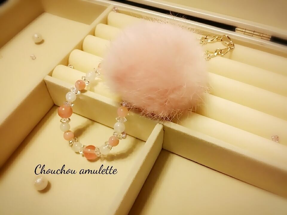 パワーストーンブレスレット付きのファーバッグチャームです。