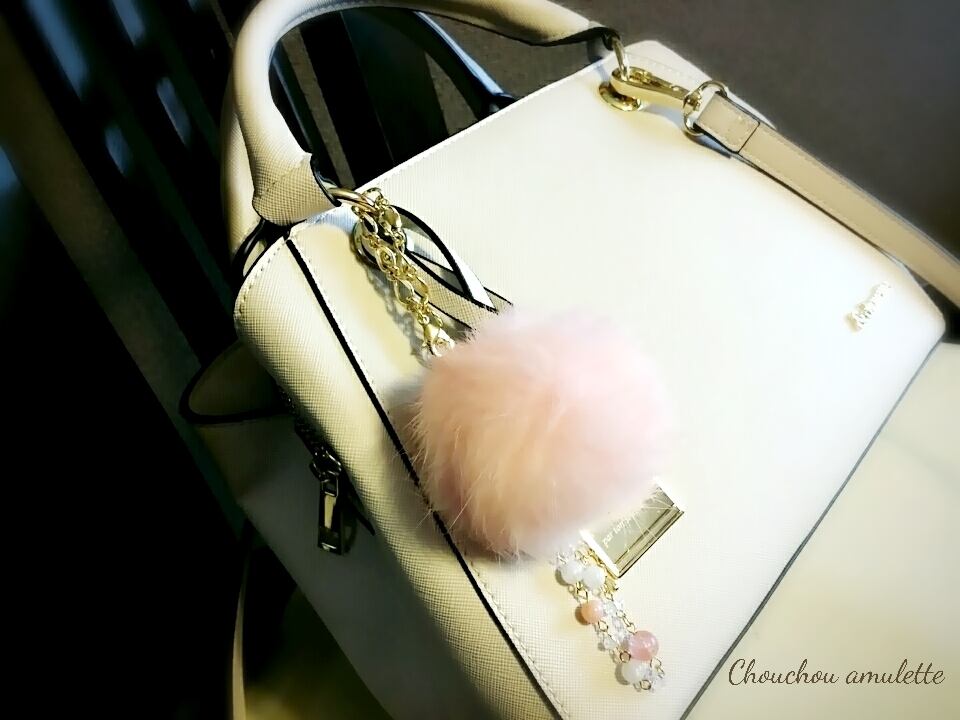 パワーストーンブレスレット付きのファーバッグチャームです。