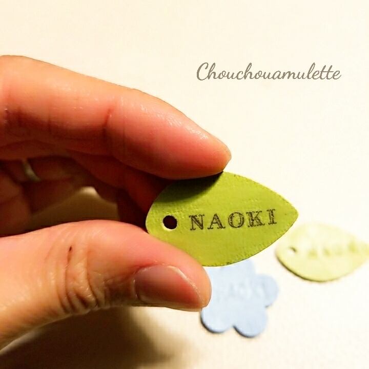 お名前はレザーモチーフにアルファベット又は数字で刻印か転写させてもらいます。